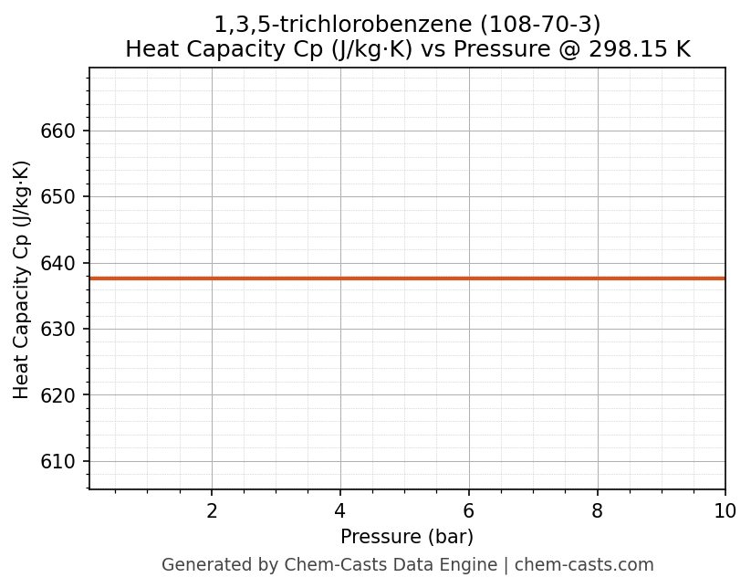 This page presents the pressure-dependent thermodynamic and transport properties of 1,3,5-trichlorobenzene (CAS 108-70-3) calculated at a constant temperature of 298 K (25 °C) over the pressure range 0.10-10 bar.