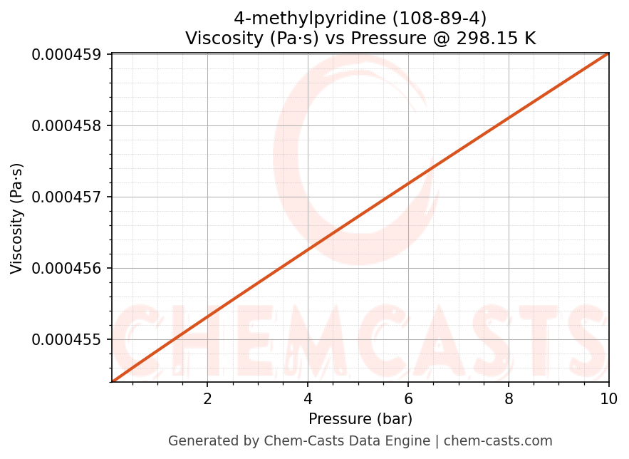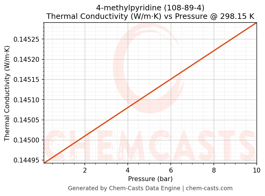 This page presents the pressure-dependent thermodynamic and transport properties of 4-methylpyridine (CAS 108-89-4) calculated at a constant temperature of 298 K (25 °C) over the pressure range 0.10-10 bar.