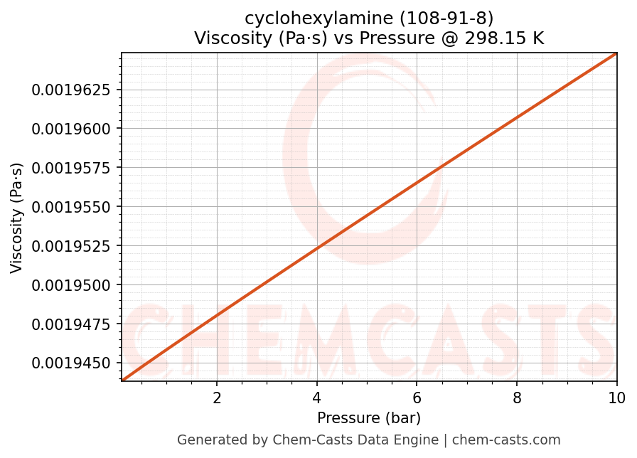 This page presents the pressure-dependent thermodynamic and transport properties of cyclohexylamine (CAS 108-91-8) calculated at a constant temperature of 298 K (25 °C) over the pressure range 0.10-10 bar.