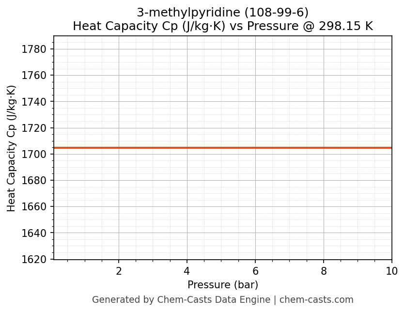 This page presents the pressure-dependent thermodynamic and transport properties of 3-methylpyridine (CAS 108-99-6) calculated at a constant temperature of 298 K (25 °C) over the pressure range 0.10-10 bar.