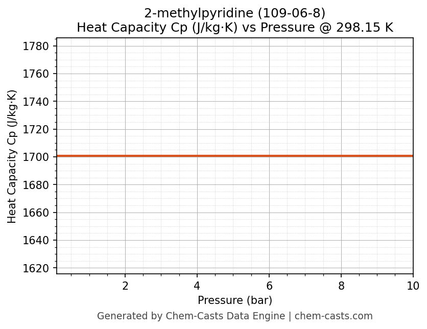 This page presents the pressure-dependent thermodynamic and transport properties of 2-methylpyridine (CAS 109-06-8) calculated at a constant temperature of 298 K (25 °C) over the pressure range 0.10-10 bar.