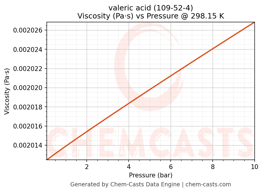 This page presents the pressure-dependent thermodynamic and transport properties of valeric acid (CAS 109-52-4) calculated at a constant temperature of 298 K (25 °C) over the pressure range 0.10-10 bar.