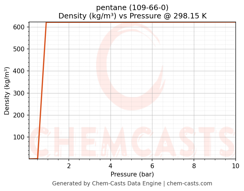 This page presents the pressure-dependent thermodynamic and transport properties of pentane (CAS 109-66-0) calculated at a constant temperature of 298 K (25 °C) over the pressure range 0.10-10 bar.