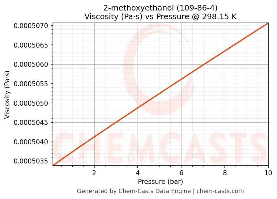 This page presents the pressure-dependent thermodynamic and transport properties of 2-methoxyethanol (CAS 109-86-4) calculated at a constant temperature of 298 K (25 °C) over the pressure range 0.10-10 bar.