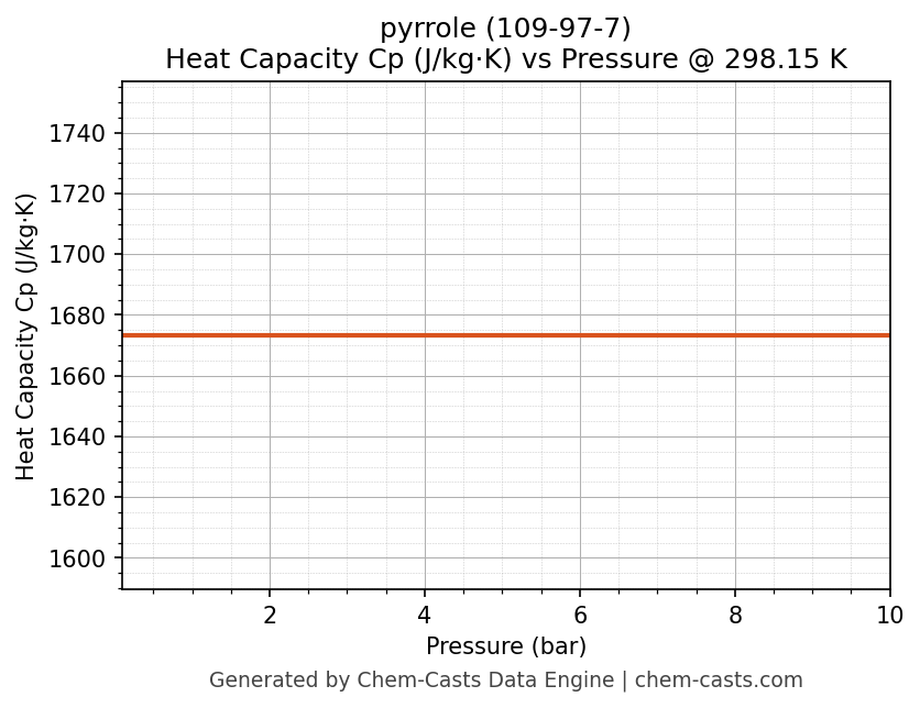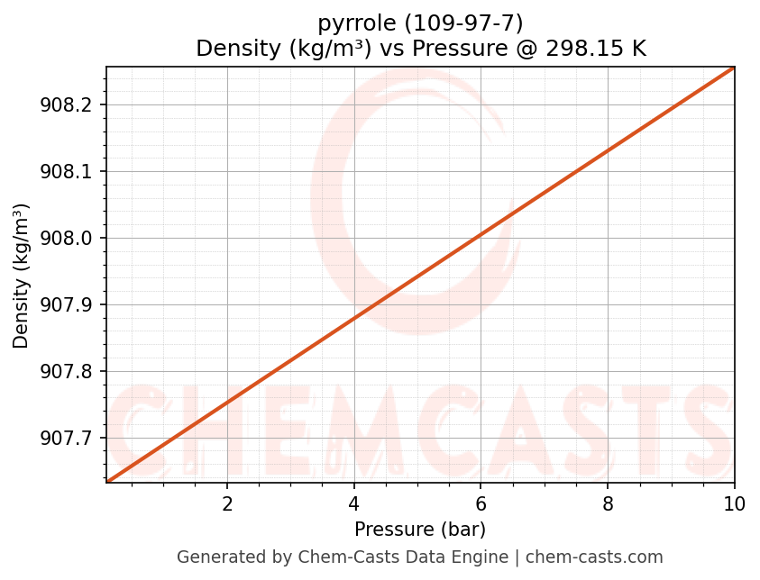 This page presents the pressure-dependent thermodynamic and transport properties of pyrrole (CAS 109-97-7) calculated at a constant temperature of 298 K (25 °C) over the pressure range 0.10-10 bar.