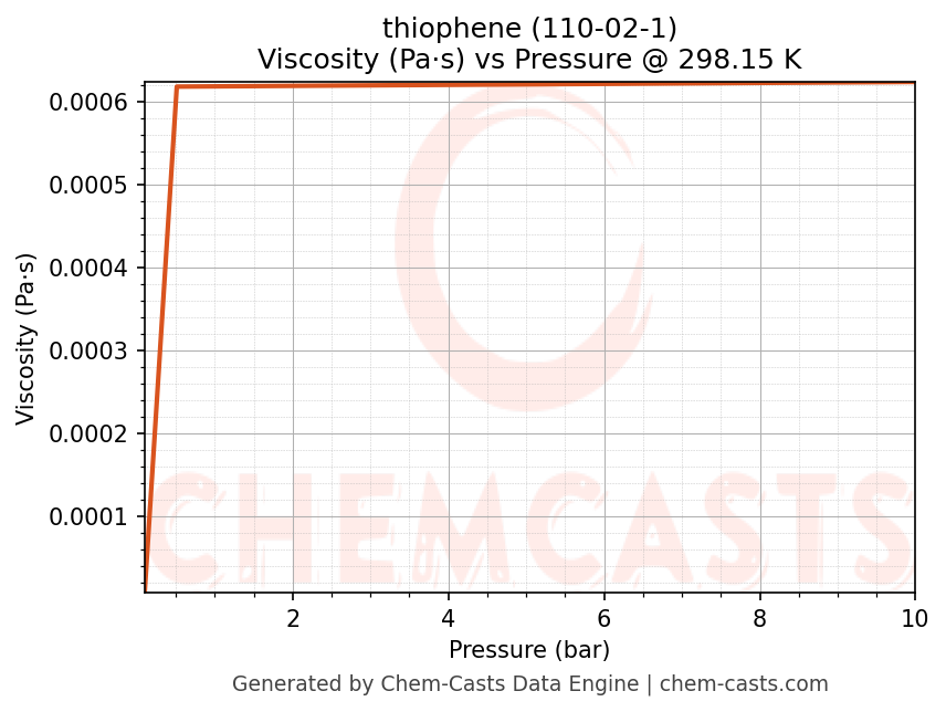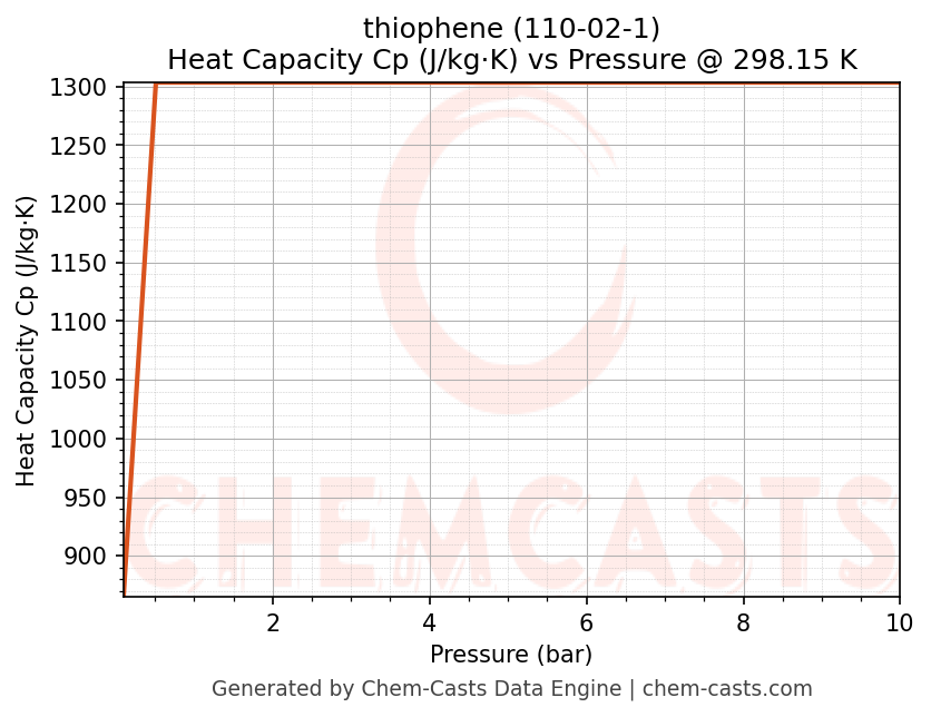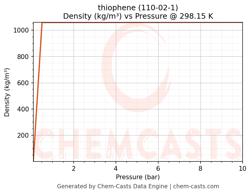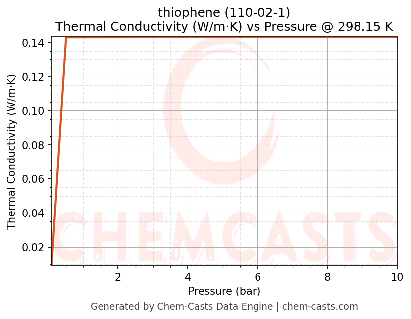 This page presents the pressure-dependent thermodynamic and transport properties of thiophene (CAS 110-02-1) calculated at a constant temperature of 298 K (25 °C) over the pressure range 0.10-10 bar.