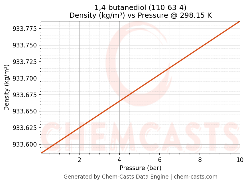 This page presents the pressure-dependent thermodynamic and transport properties of 1,4-butanediol (CAS 110-63-4) calculated at a constant temperature of 298 K (25 °C) over the pressure range 0.10-10 bar.