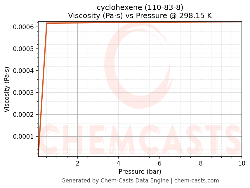 This page presents the pressure-dependent thermodynamic and transport properties of cyclohexene (CAS 110-83-8) calculated at a constant temperature of 298 K (25 °C) over the pressure range 0.10-10 bar.
