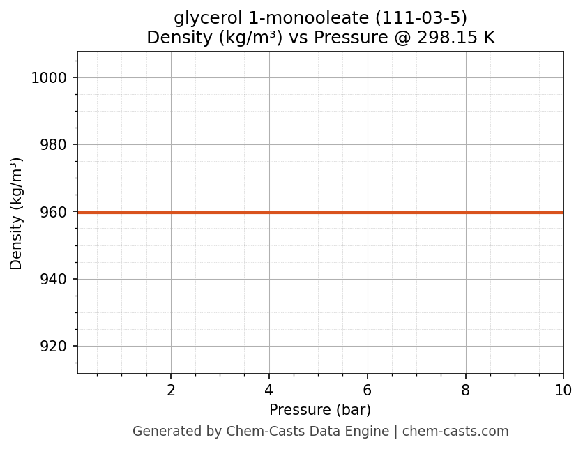 This page presents the pressure-dependent thermodynamic and transport properties of glycerol 1-monooleate (CAS 111-03-5) calculated at a constant temperature of 298 K (25 °C) over the pressure range 0.10-10 bar.