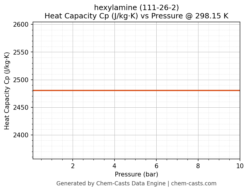 This page presents the pressure-dependent thermodynamic and transport properties of hexylamine (CAS 111-26-2) calculated at a constant temperature of 298 K (25 °C) over the pressure range 0.10-10 bar.