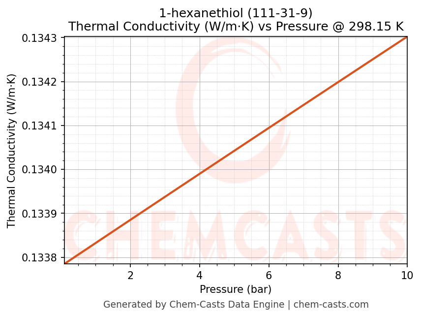 This page presents the pressure-dependent thermodynamic and transport properties of 1-hexanethiol (CAS 111-31-9) calculated at a constant temperature of 298 K (25 °C) over the pressure range 0.10-10 bar.
