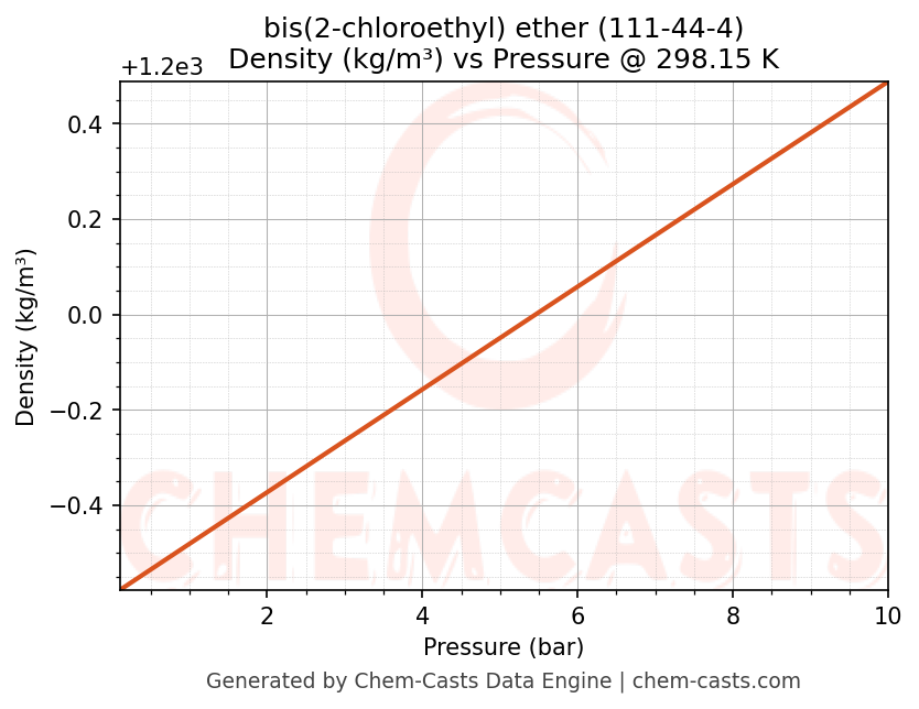 This page presents the pressure-dependent thermodynamic and transport properties of bis(2-chloroethyl) ether (CAS 111-44-4) calculated at a constant temperature of 298 K (25 °C) over the pressure range 0.10-10 bar.