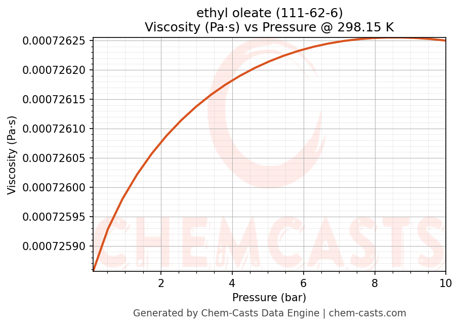 This page presents the pressure-dependent thermodynamic and transport properties of ethyl oleate (CAS 111-62-6) calculated at a constant temperature of 298 K (25 °C) over the pressure range 0.10-10 bar.