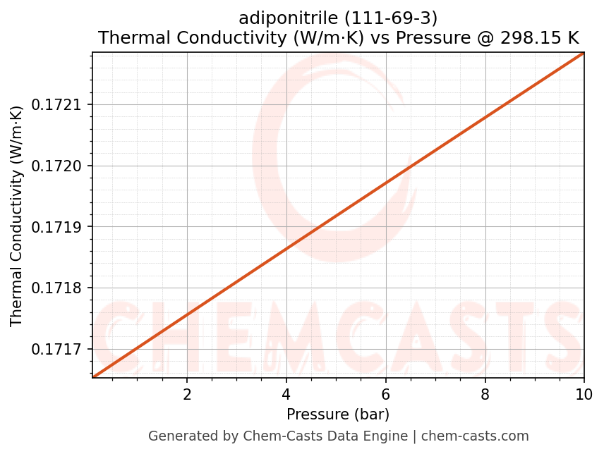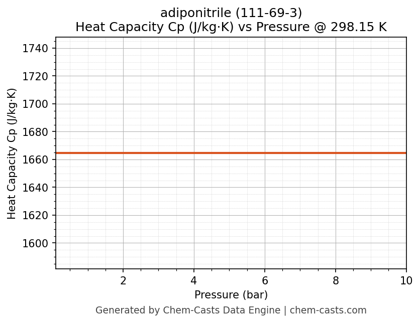 This page presents the pressure-dependent thermodynamic and transport properties of adiponitrile (CAS 111-69-3) calculated at a constant temperature of 298 K (25 °C) over the pressure range 0.10-10 bar.