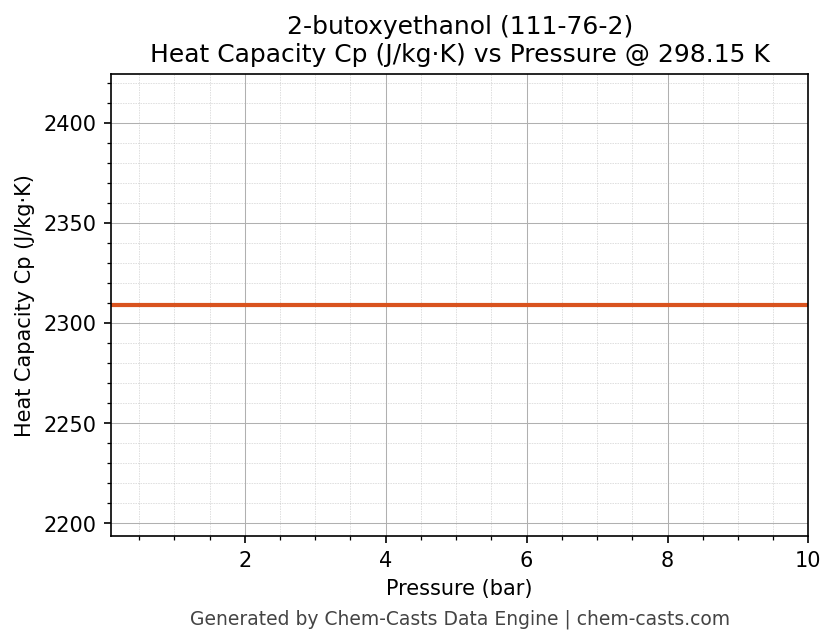 This page presents the pressure-dependent thermodynamic and transport properties of 2-butoxyethanol (CAS 111-76-2) calculated at a constant temperature of 298 K (25 °C) over the pressure range 0.10-10 bar.