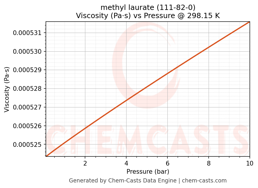 This page presents the pressure-dependent thermodynamic and transport properties of methyl laurate (CAS 111-82-0) calculated at a constant temperature of 298 K (25 °C) over the pressure range 0.10-10 bar.