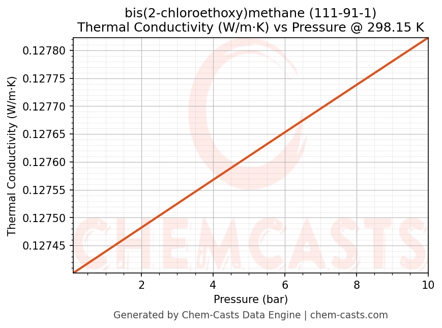 This page presents the pressure-dependent thermodynamic and transport properties of bis(2-chloroethoxy)methane (CAS 111-91-1) calculated at a constant temperature of 298 K (25 °C) over the pressure range 0.10-10 bar.