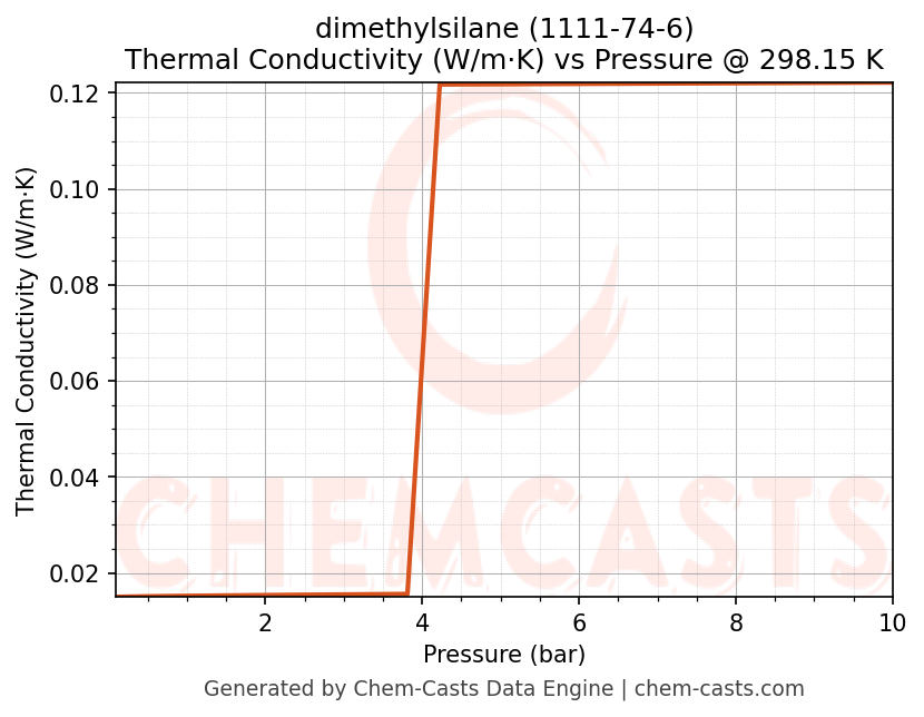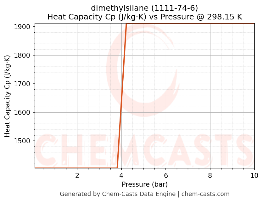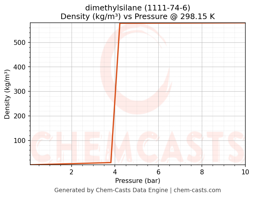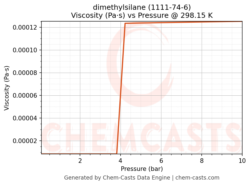 This page presents the pressure-dependent thermodynamic and transport properties of dimethylsilane (CAS 1111-74-6) calculated at a constant temperature of 298 K (25 °C) over the pressure range 0.10-10 bar.