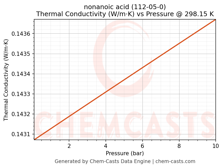 This page presents the pressure-dependent thermodynamic and transport properties of nonanoic acid (CAS 112-05-0) calculated at a constant temperature of 298 K (25 °C) over the pressure range 0.10-10 bar.