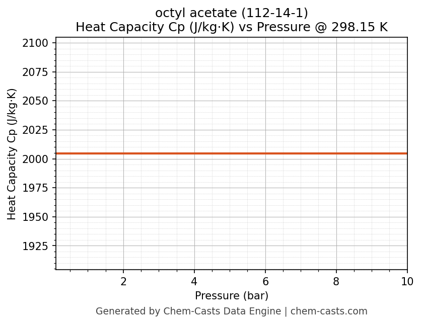 This page presents the pressure-dependent thermodynamic and transport properties of octyl acetate (CAS 112-14-1) calculated at a constant temperature of 298 K (25 °C) over the pressure range 0.10-10 bar.