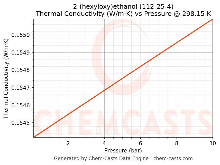 This page presents the pressure-dependent thermodynamic and transport properties of 2-(hexyloxy)ethanol (CAS 112-25-4) calculated at a constant temperature of 298 K (25 °C) over the pressure range 0.10-10 bar.