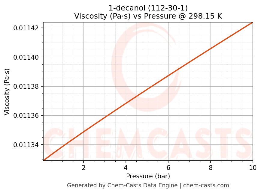 This page presents the pressure-dependent thermodynamic and transport properties of 1-decanol (CAS 112-30-1) calculated at a constant temperature of 298 K (25 °C) over the pressure range 0.10-10 bar.