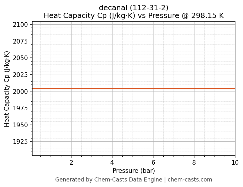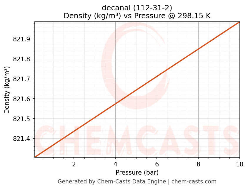This page presents the pressure-dependent thermodynamic and transport properties of decanal (CAS 112-31-2) calculated at a constant temperature of 298 K (25 °C) over the pressure range 0.10-10 bar.