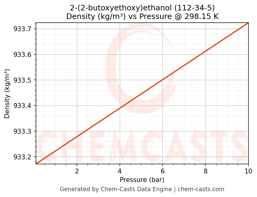 This page presents the pressure-dependent thermodynamic and transport properties of 2-(2-butoxyethoxy)ethanol (CAS 112-34-5) calculated at a constant temperature of 298 K (25 °C) over the pressure range 0.10-10 bar.