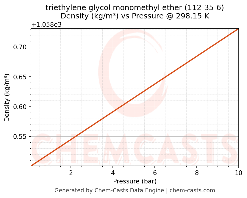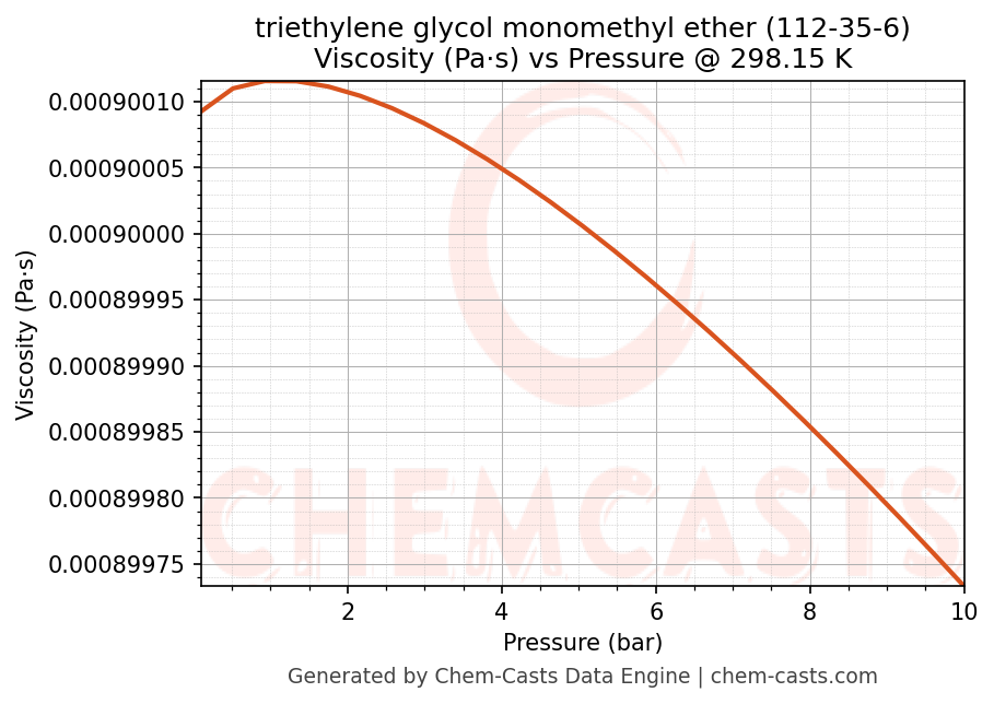 This page presents the pressure-dependent thermodynamic and transport properties of triethylene glycol monomethyl ether (CAS 112-35-6) calculated at a constant temperature of 298 K (25 °C) over the pressure range 0.10-10 bar.