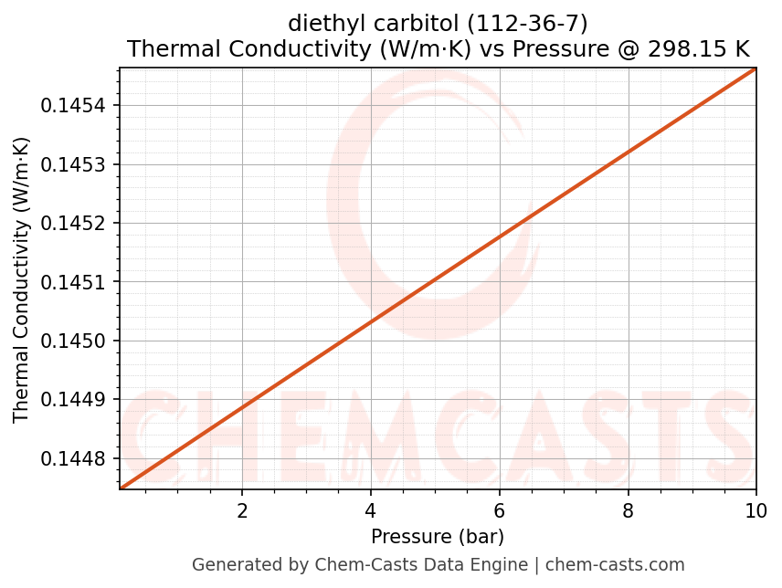 This page presents the pressure-dependent thermodynamic and transport properties of diethyl carbitol (CAS 112-36-7) calculated at a constant temperature of 298 K (25 °C) over the pressure range 0.10-10 bar.