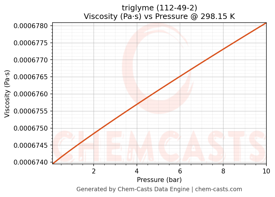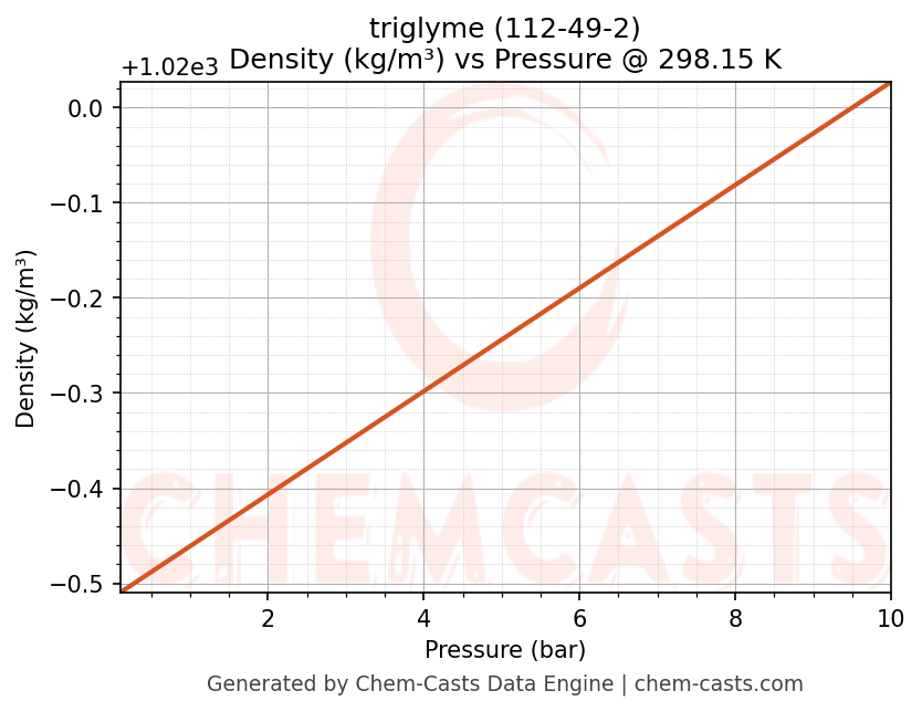 This page presents the pressure-dependent thermodynamic and transport properties of triglyme (CAS 112-49-2) calculated at a constant temperature of 298 K (25 °C) over the pressure range 0.10-10 bar.