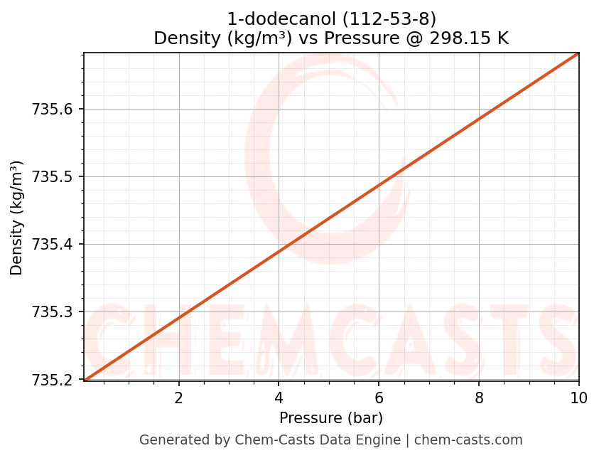 This page presents the pressure-dependent thermodynamic and transport properties of 1-dodecanol (CAS 112-53-8) calculated at a constant temperature of 298 K (25 °C) over the pressure range 0.10-10 bar.