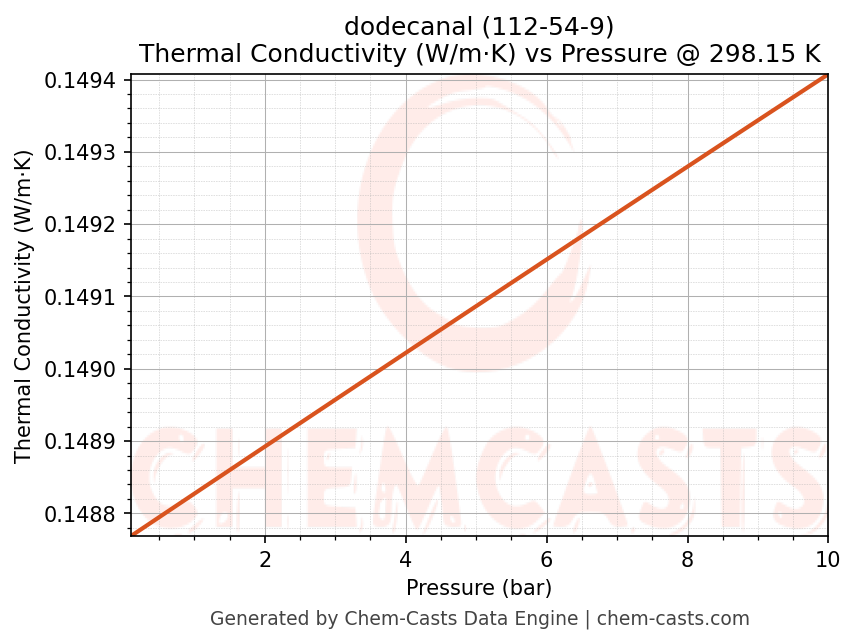 This page presents the pressure-dependent thermodynamic and transport properties of dodecanal (CAS 112-54-9) calculated at a constant temperature of 298 K (25 °C) over the pressure range 0.10-10 bar.