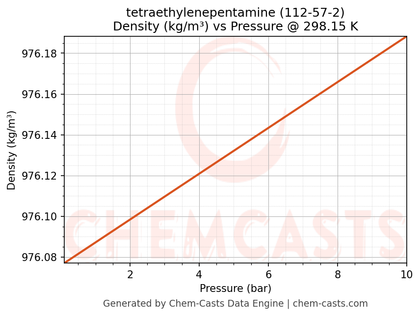 This page presents the pressure-dependent thermodynamic and transport properties of tetraethylenepentamine (CAS 112-57-2) calculated at a constant temperature of 298 K (25 °C) over the pressure range 0.10-10 bar.