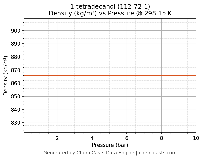 This page presents the pressure-dependent thermodynamic and transport properties of 1-tetradecanol (CAS 112-72-1) calculated at a constant temperature of 298 K (25 °C) over the pressure range 0.10-10 bar.