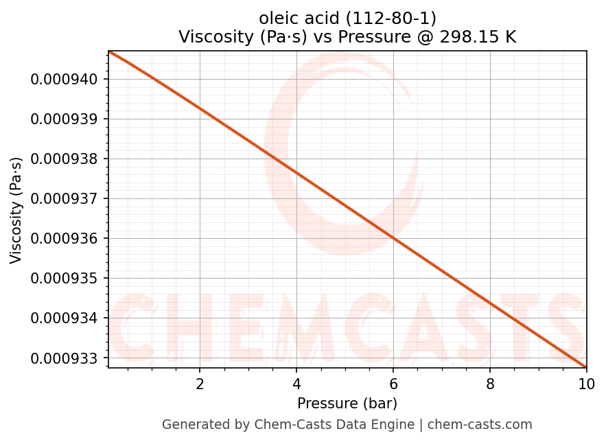 This page presents the pressure-dependent thermodynamic and transport properties of oleic acid (CAS 112-80-1) calculated at a constant temperature of 298 K (25 °C) over the pressure range 0.10-10 bar.