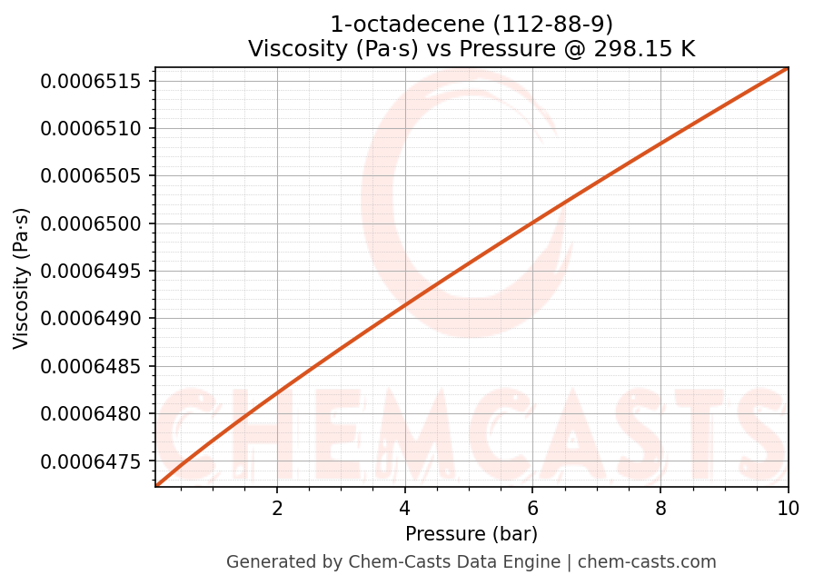 This page presents the pressure-dependent thermodynamic and transport properties of 1-octadecene (CAS 112-88-9) calculated at a constant temperature of 298 K (25 °C) over the pressure range 0.10-10 bar.