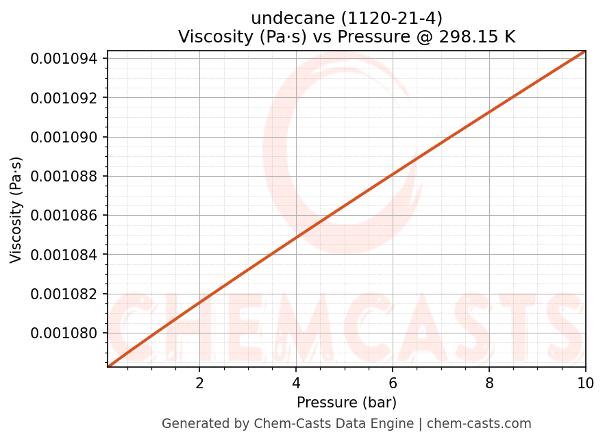 This page presents the pressure-dependent thermodynamic and transport properties of undecane (CAS 1120-21-4) calculated at a constant temperature of 298 K (25 °C) over the pressure range 0.10-10 bar.