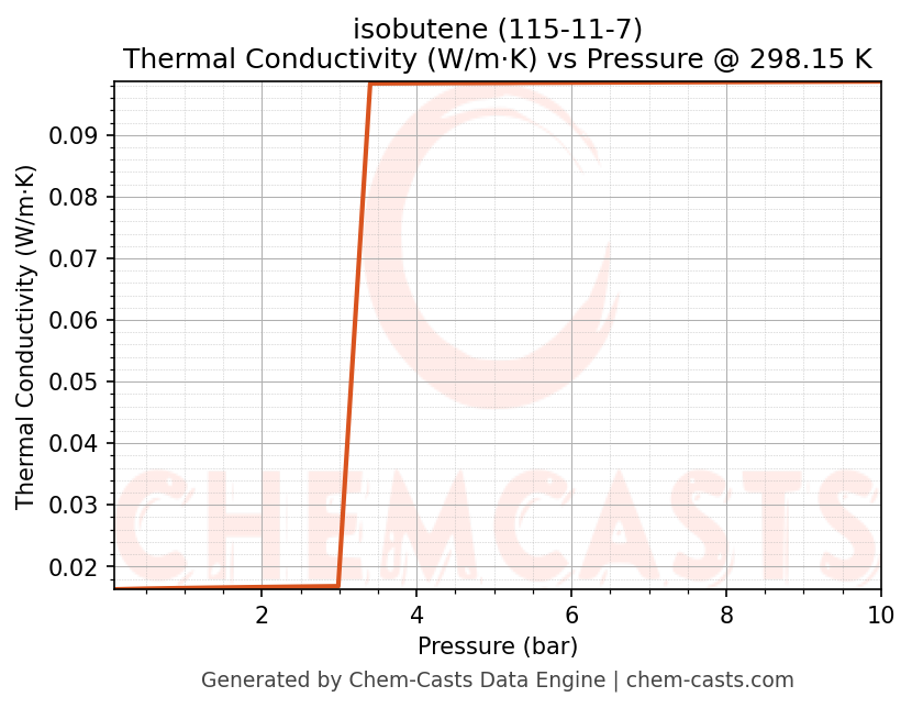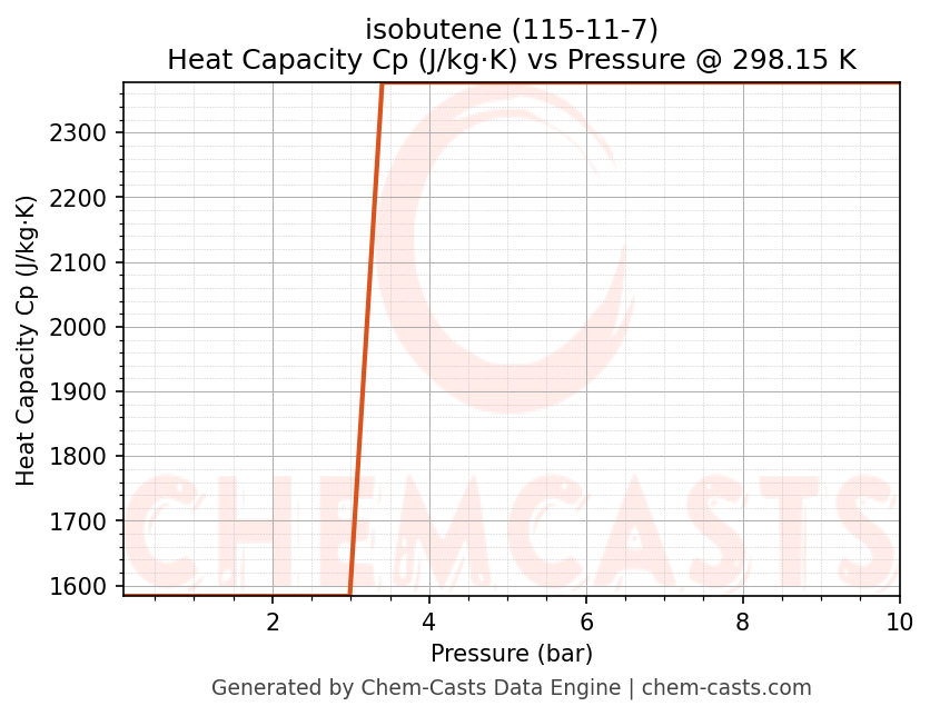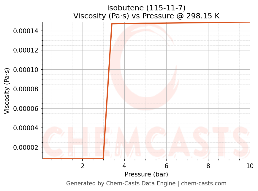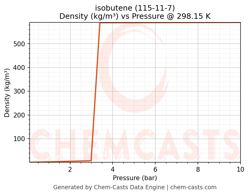 This page presents the pressure-dependent thermodynamic and transport properties of isobutene (CAS 115-11-7) calculated at a constant temperature of 298 K (25 °C) over the pressure range 0.10-10 bar.
