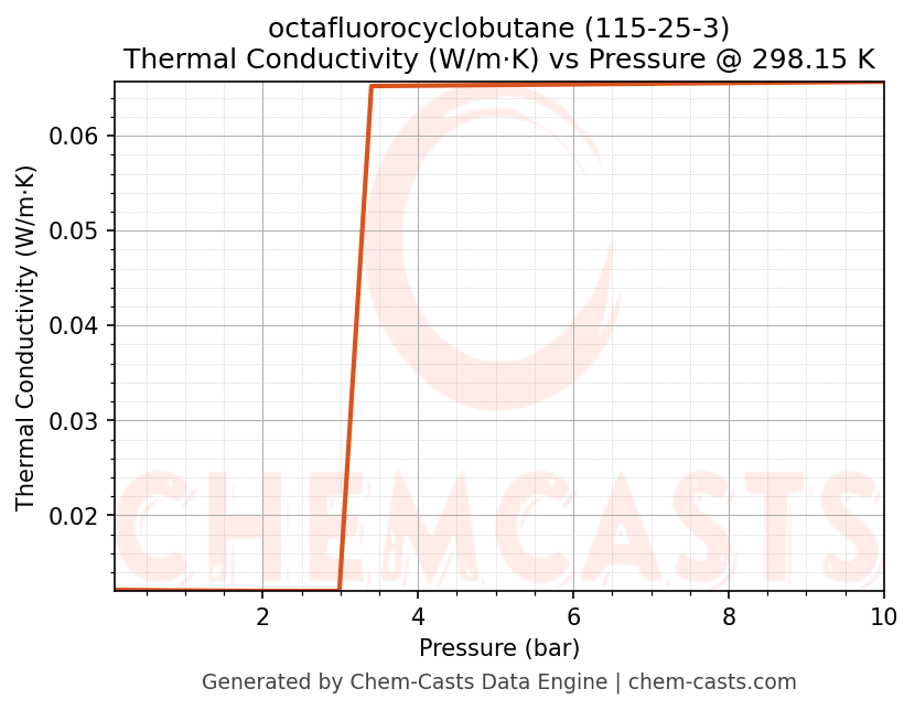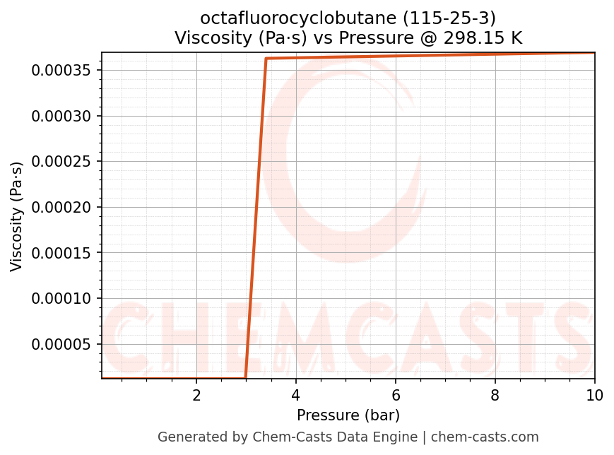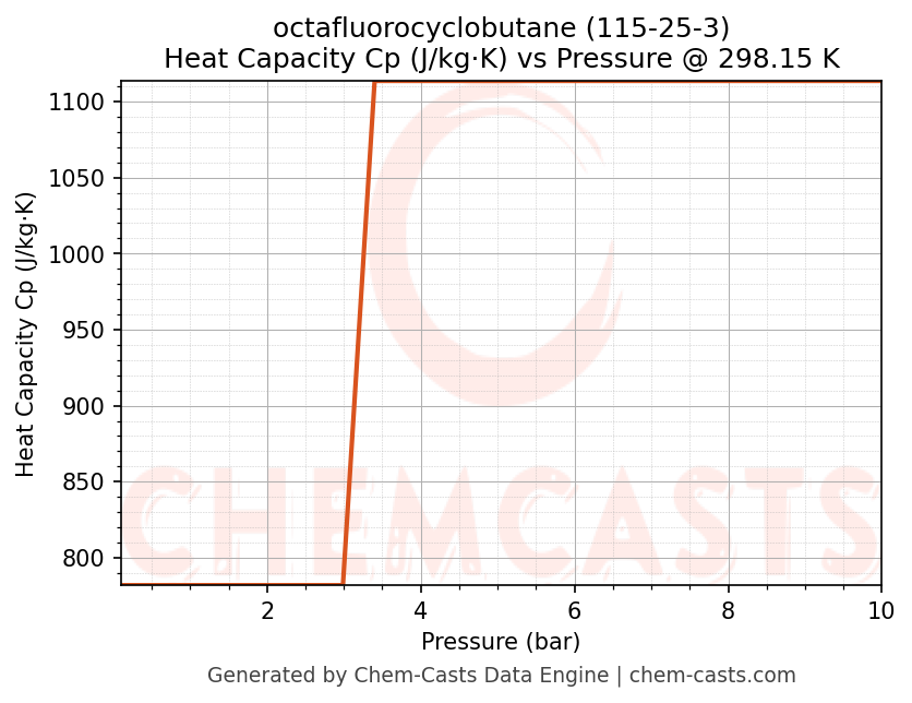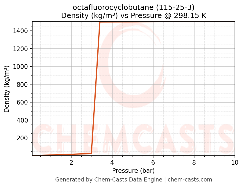 This page presents the pressure-dependent thermodynamic and transport properties of octafluorocyclobutane (CAS 115-25-3) calculated at a constant temperature of 298 K (25 °C) over the pressure range 0.10-10 bar.