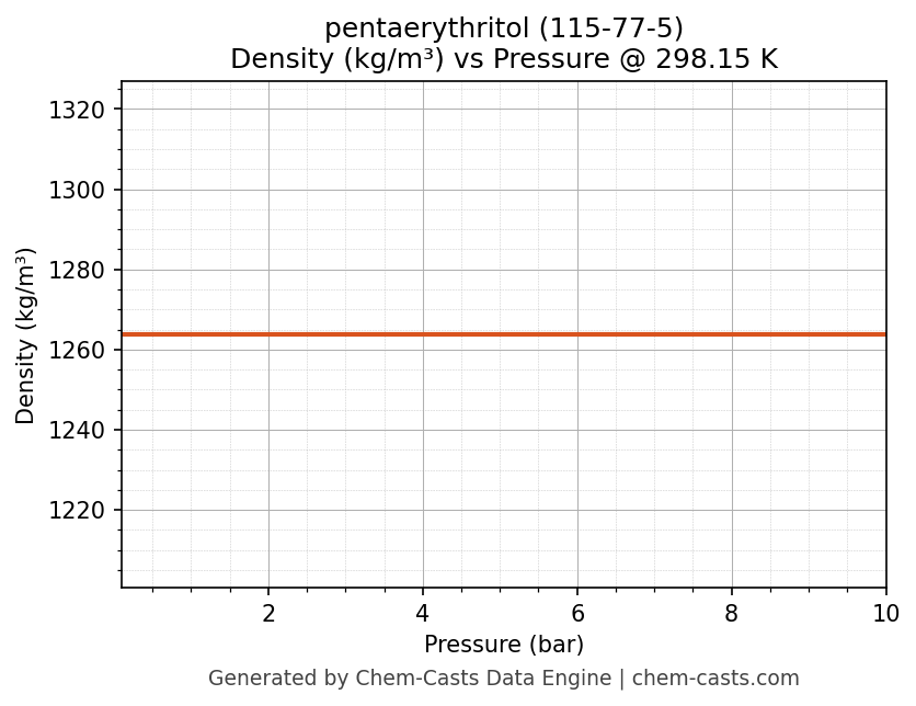 This page presents the pressure-dependent thermodynamic and transport properties of pentaerythritol (CAS 115-77-5) calculated at a constant temperature of 298 K (25 °C) over the pressure range 0.10-10 bar.