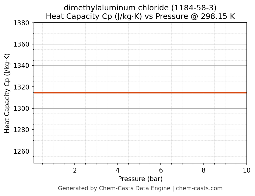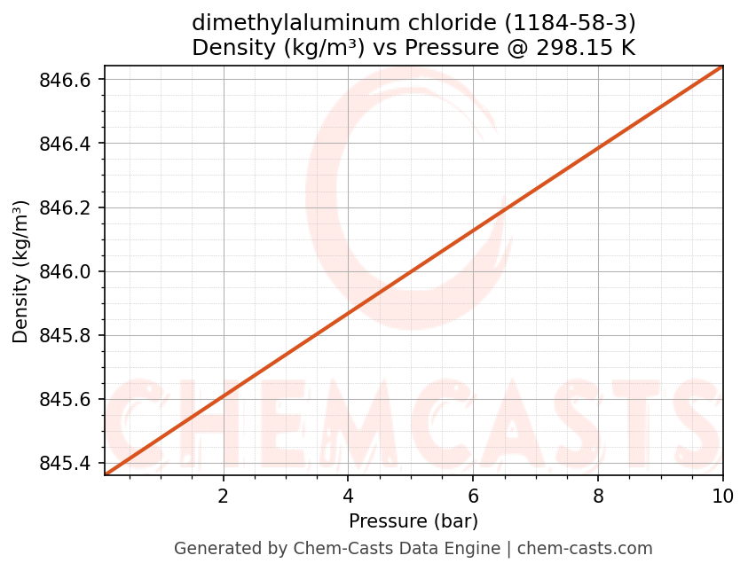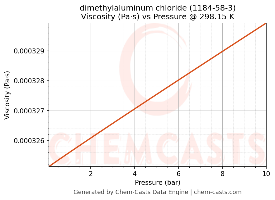 This page presents the pressure-dependent thermodynamic and transport properties of dimethylaluminum chloride (CAS 1184-58-3) calculated at a constant temperature of 298 K (25 °C) over the pressure range 0.10-10 bar.