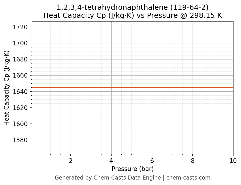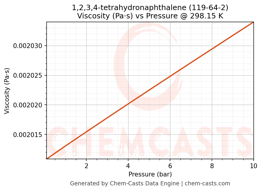 This page presents the pressure-dependent thermodynamic and transport properties of 1,2,3,4-tetrahydronaphthalene (CAS 119-64-2) calculated at a constant temperature of 298 K (25 °C) over the pressure range 0.10-10 bar.