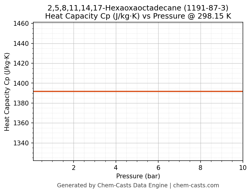 This page presents the pressure-dependent thermodynamic and transport properties of 2,5,8,11,14,17-Hexaoxaoctadecane (CAS 1191-87-3) calculated at a constant temperature of 298 K (25 °C) over the pressure range 0.10-10 bar.