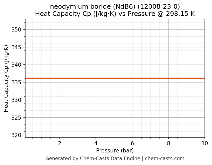 This page presents the pressure-dependent thermodynamic and transport properties of neodymium boride (NdB6) (CAS 12008-23-0) calculated at a constant temperature of 298 K (25 °C) over the pressure range 0.10-10 bar.