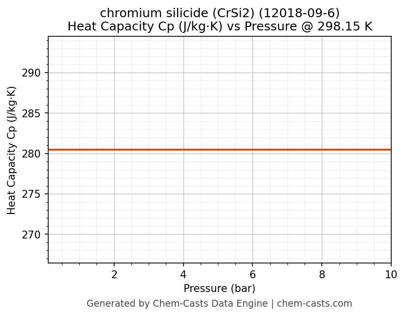 This page presents the pressure-dependent thermodynamic and transport properties of chromium silicide (CrSi2) (CAS 12018-09-6) calculated at a constant temperature of 298 K (25 °C) over the pressure range 0.10-10 bar.