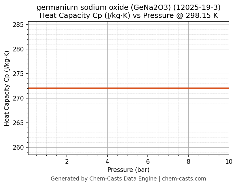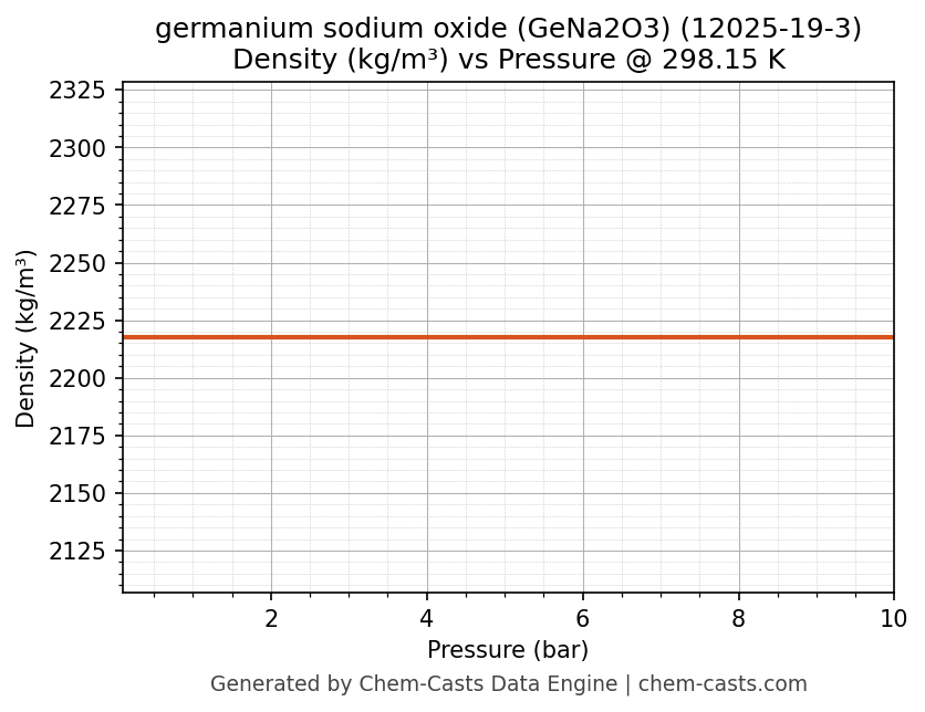 This page presents the pressure-dependent thermodynamic and transport properties of germanium sodium oxide (GeNa2O3) (CAS 12025-19-3) calculated at a constant temperature of 298 K (25 °C) over the pressure range 0.10-10 bar.