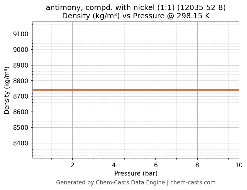 This page presents the pressure-dependent thermodynamic and transport properties of antimony, compd. with nickel (1:1) (CAS 12035-52-8) calculated at a constant temperature of 298 K (25 °C) over the pressure range 0.10-10 bar.