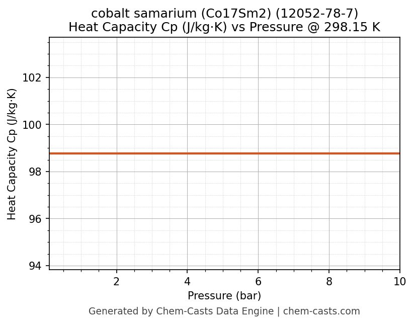 This page presents the pressure-dependent thermodynamic and transport properties of cobalt samarium (Co17Sm2) (CAS 12052-78-7) calculated at a constant temperature of 298 K (25 °C) over the pressure range 0.10-10 bar.