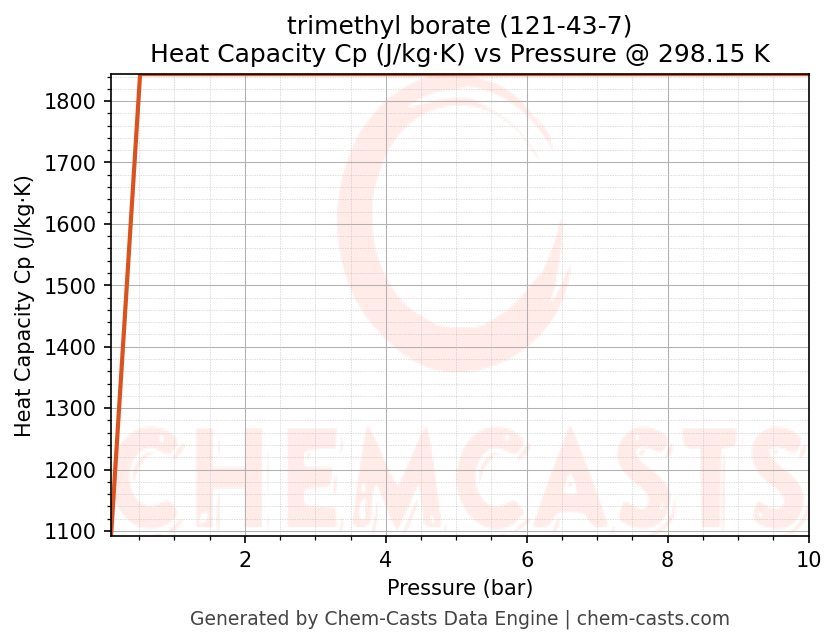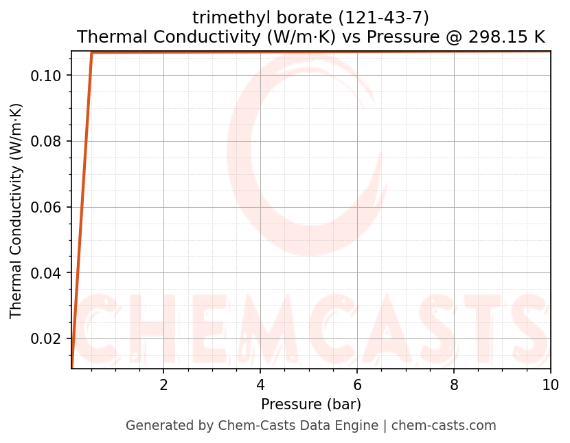 This page presents the pressure-dependent thermodynamic and transport properties of trimethyl borate (CAS 121-43-7) calculated at a constant temperature of 298 K (25 °C) over the pressure range 0.10-10 bar.